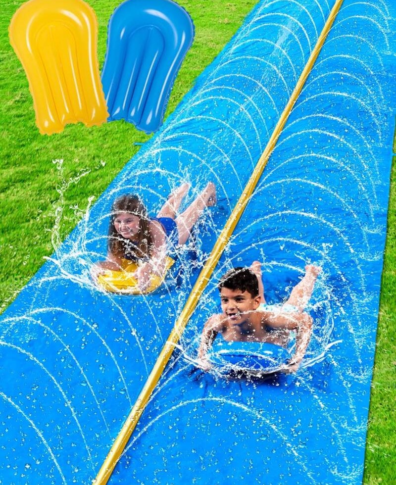 Lay down a slip and slide on your lawn and let kids race to the end. Add a bit of dish soap for extra speed and fun.