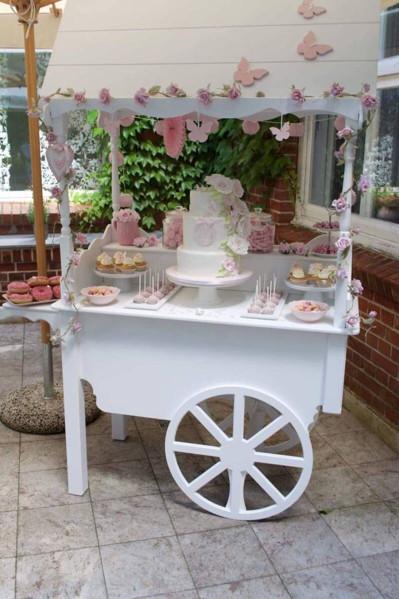 Rent or DIY a candy cart, then decorate it with pastel jars, ribbons, and signage like “Love is Sweet.” This can also double as a dessert station.