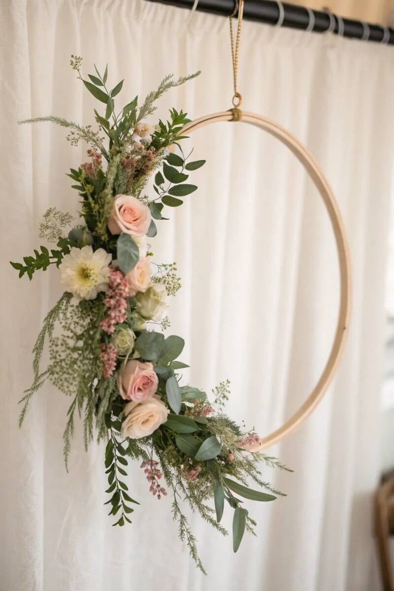 Use embroidery hoops wrapped in flowers and greenery as wall or ceiling décor.