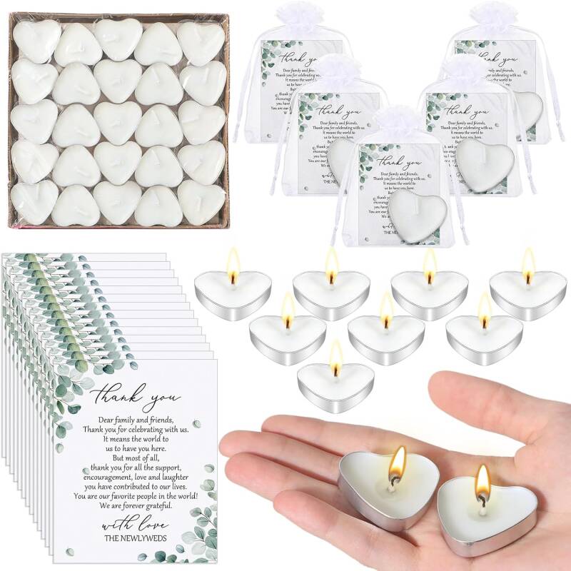 The 100 Sets Wedding Gifts for Guests Heart Shaped Candles offer a sweet and sentimental way to thank your guests for sharing in your special day. Each set includes a mini heart-shaped candle, symbolizing love and warmth, making it an ideal favor for weddings, bridal showers, or any romantic celebration. These charming candles come with thank you cards and elegant organza bags, allowing you to easily create beautifully packaged, personalized gifts for each of your guests. Perfect as party favors, these heart-shaped candles are not just a thoughtful token of appreciation but also a lovely keepsake that will remind your guests of the love and joy shared on your wedding day.