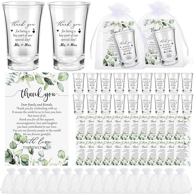The Uiifan 100 Sets Short Glasses Wedding Favors are a thoughtful and stylish option for thanking your guests at any wedding. Each set includes a clear acrylic shot glass, which serves as a practical and memorable souvenir, perfect for celebrating your special day. The shot glasses come with an elegant thank you card, allowing you to express your gratitude in a personalized way. To complete the presentation, each glass is accompanied by a delicate organza bag, making it easy to gift to your friends and family. These affordable, ready-to-give favors are ideal for adding a touch of sophistication to your event while showing appreciation to your loved ones.