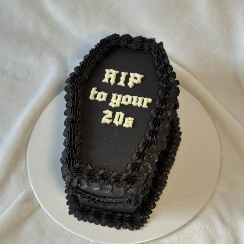 - Dramatic cake decoration like “RIP 20s”
