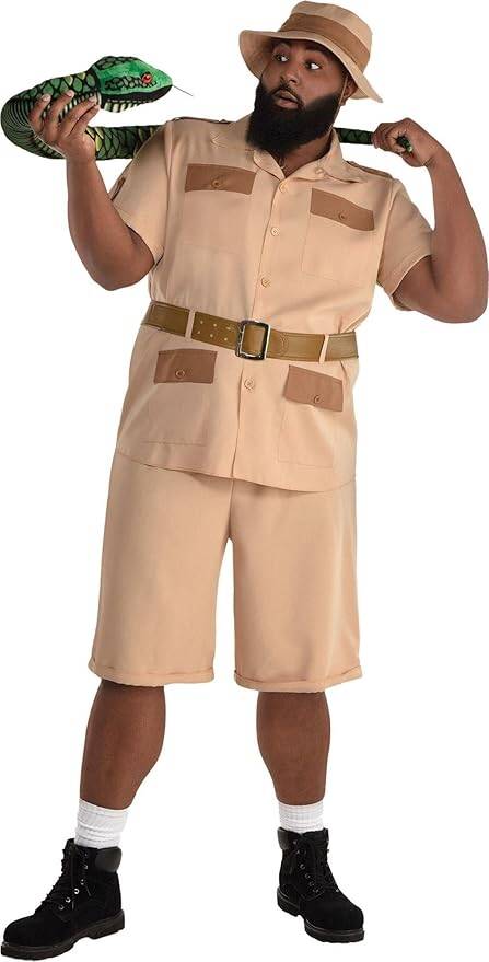 - Khaki Safari Jacket: The centerpiece of the Jungle Safari Guide costume is the classic khaki safari jacket. Typically made from durable, breathable fabric, the jacket features multiple pockets for carrying essentials such as maps, binoculars, and other tools. It often includes a belted waist and rolled-up sleeves, giving it a rugged yet functional appearance.